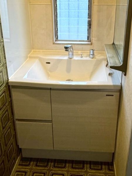 洗面化粧台を新しくしたいとご相談いただき、取り替えました!正面には窓があるので下台のみの取り替えです。ぴったりサイズの収納扉付きで大容量の収納で見た目もスッキリになりお喜び頂きました♪