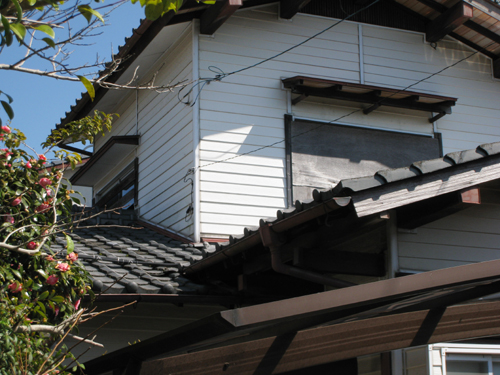 2階の窓は施工前、台風対策の板を張ったままになっていました。